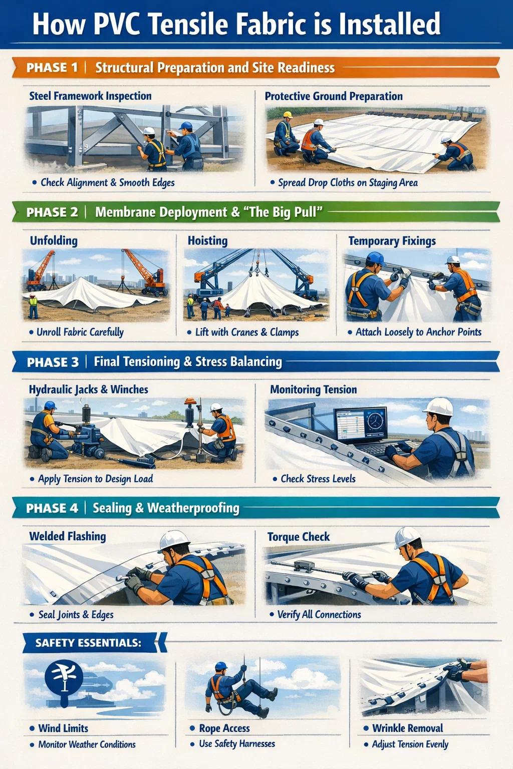 กำลังติดตั้ง ผ้ายืดพีวีซี เป็นกระบวนการที่ออกแบบอย่างแม่นยำซึ่งเปลี่ยนเมมเบรนที่ยืดหยุ่นให้เป็นหลังคาที่มีโครงสร้างแข็ง ต่างจากหลังคาแบบเดิมตรงที่การติดตั้งต้องอาศัย ความตึงเครียดทางวิศวกรรม แทนที่จะเป็นมวล กระบวนการเริ่มต้นด้วยการสร้างโครงสร้างรองรับเหล็กหรือไม้ขั้นต้น ตามด้วยการคลี่ผ้าออกอย่างระมัดระวัง การยึดเข้ากับขอบด้านนอก และระยะ "การตึง" อย่างเป็นระบบ โดยที่วัสดุจะถูกดึงไปยังความเค้นการออกแบบที่คำนวณไว้ เพื่อให้แน่ใจว่ามีความต้านทานต่อแรงลมและหิมะ