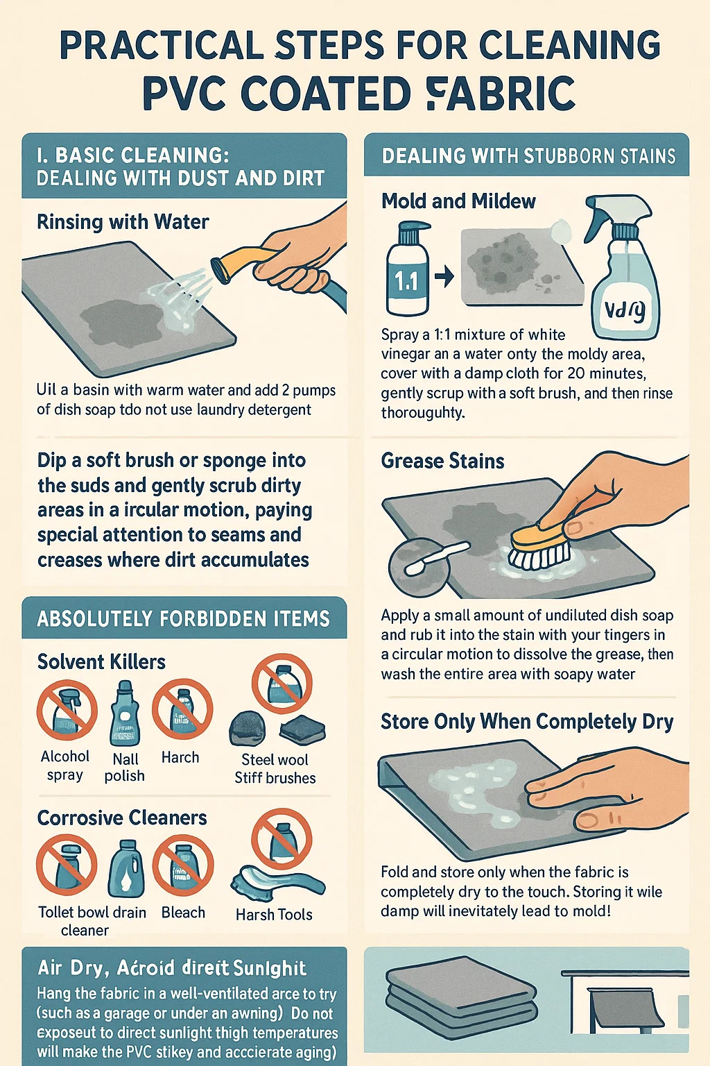 Air Dry, Avoid Direct Sunlight: Hang the fabric in a well-ventilated area to dry (such as a garage or under an awning). Do not expose it to direct sunlight (high temperatures will make the PVC sticky and accelerate aging).