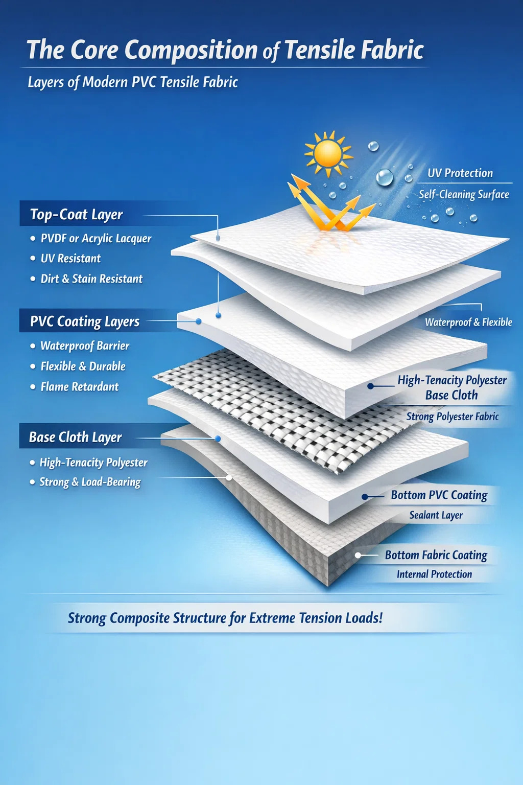 ทันสมัยที่สุด ผ้ายืดพีวีซี เป็นวัสดุคอมโพสิตที่ซับซ้อนซึ่งประกอบด้วยชั้นหลักสามชั้น: ผ้าฐานโพลีเอสเตอร์ความดื้อรั้นสูง หนา เคลือบพีวีซี (โพลีไวนิลคลอไรด์) และเชี่ยวชาญเฉพาะทาง แล็กเกอร์เคลือบด้านบน เช่น PVDF หรืออะคริลิก ผ้าด้านในให้ความแข็งแรงของโครงสร้างเพื่อรองรับแรงตึงขนาดใหญ่ ในขณะที่ชั้นพลาสติกด้านนอกป้องกันเส้นใยจากการเสื่อมสภาพของสิ่งแวดล้อม น้ำ และไฟ