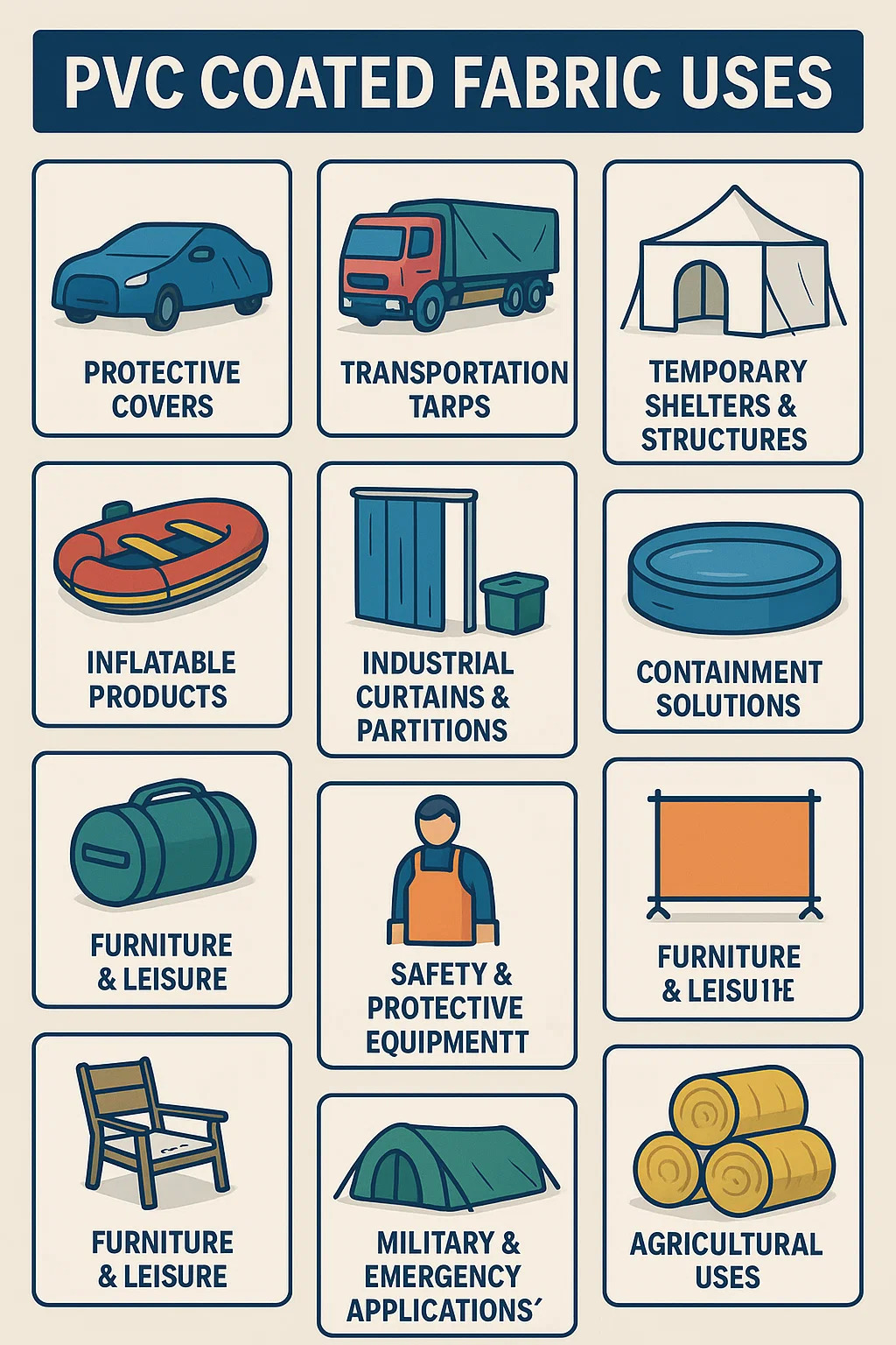 ต่อไปนี้เป็นรายละเอียดการใช้งานทั่วไปสำหรับ ผ้าเคลือบพีวีซี สะท้อนถึงการใช้งานจริง: